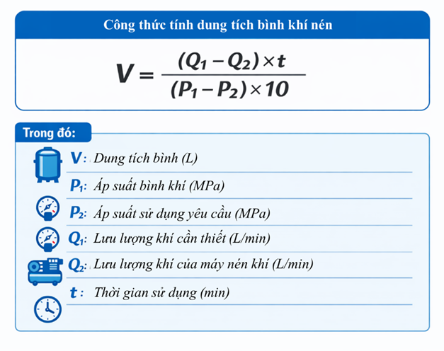 Dung tích của bình tích khí nén có thể được xác định bằng công thức sau.
